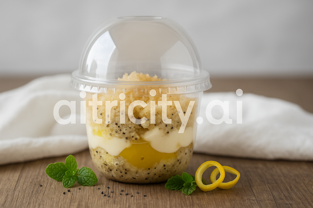 Bring a touch of zest to your visuals with this professionally styled still image. The photo features a layered lemon poppy cake with cream and lemon curd, presented in a clear dome cup for a modern grab-and-go look. Finished with mint leaves and a twist of lemon zest, this shot conveys freshness and indulgence.